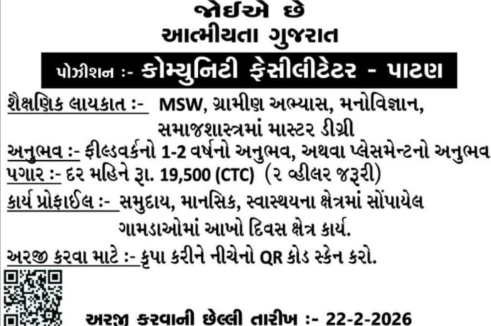 Atmiya Project Recruitment Gujarat: શું તમે ગ્રામીણ વિકાસમાં કામ કરીને લોકોના જીવનમાં વાસ્તવિક ફેરફાર લાવવા માંગો છો? આત્મીયતા ગુજરાત સંસ્થા પાટણ જિલ્લામાં કોમ્યુનિટી ફેસીલીટેટર (સમુદાય સુવિધાકર્તા) ની પોસ્ટ માટે અરજીઓ માંગી રહી છે. સામાજિક કાર્યના પૃષ્ઠભૂમિ ધરાવતા લોકો માટે આ એક અનોખી તક છે. અરજી કરવાની છેલ્લી તારીખ 22 ફેબ્રુઆરી, 2026 છે. અહીં તમારી બધી જરૂરી માહિતી સરળ ભાષામાં આપવામાં આવી છે.