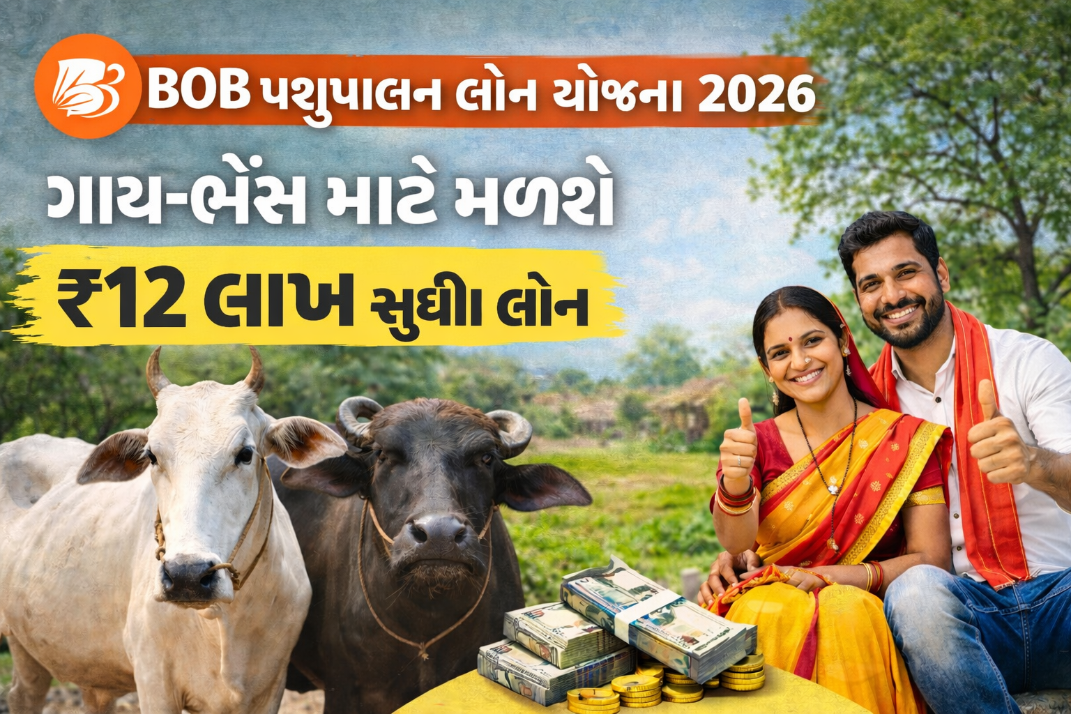 BOB Pashupalan Loan Yojana 2026 ખેડૂતો અને પશુપાલકો માટે ખૂબ જ લાભદાયી યોજના છે. આ યોજના દ્વારા ખેડૂતો સરળતાથી ગાય-ભેંસ અથવા અન્ય પશુ ખરીદી શકે છે અને પોતાનો ડેરી વ્યવસાય શરૂ કરી શકે છે. જો તમે પશુપાલન વ્યવસાય શરૂ કરવા માંગતા હોવ તો Bank of Baroda ની આ યોજના તમારા માટે એક ઉત્તમ તક બની શકે છે.