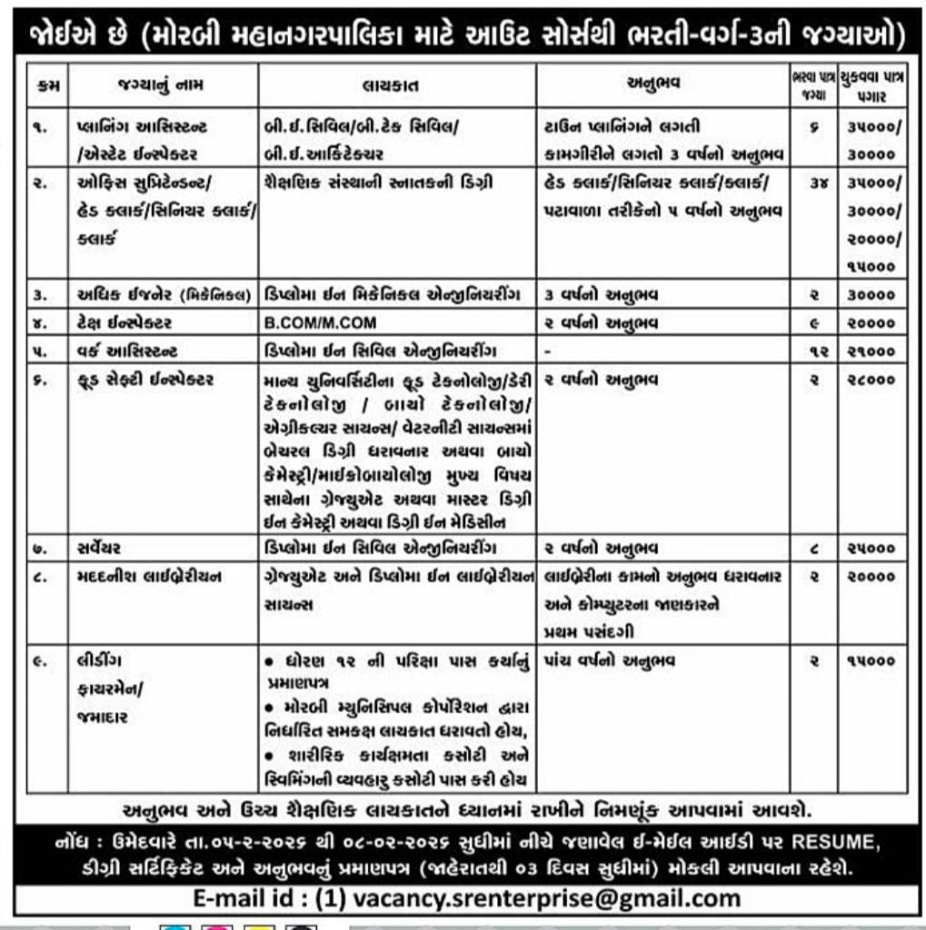 | વર્ક આસિસ્ટન્ટ | સિવિલ ઈજનેરીંગમાં ડિપ્લોમા | 2 વર્ષનો અનુભવ |