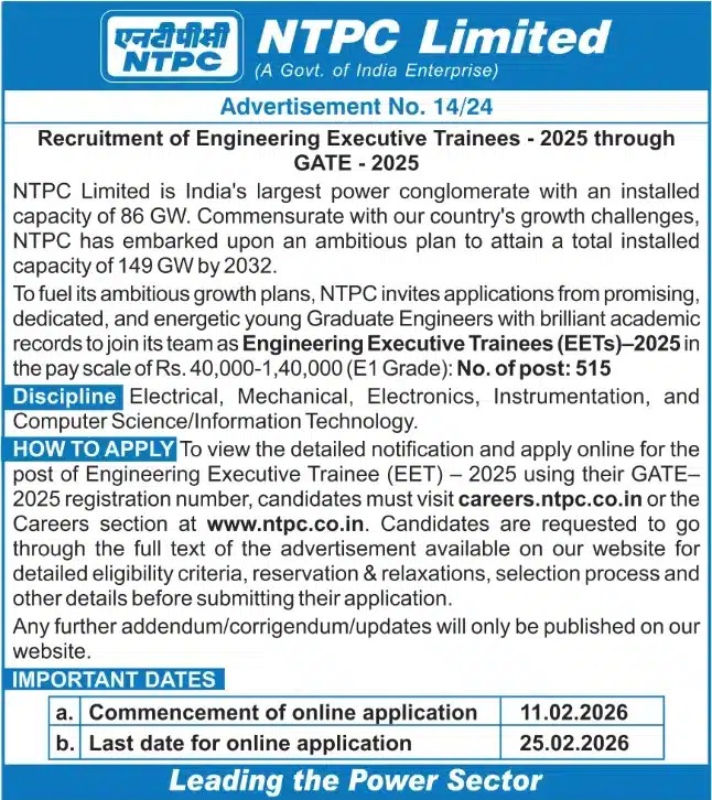 NTPC લિમિટેડમાં એન્જિનિયરિંગ એક્ઝિક્યુટિવ ટ્રેઇની (EET) ની ભરતી એ દરેક યુવા એન્જિનિયર માટે એક સુવર્ણ તક છે. 515 ખાલી જગ્યાઓ સાથે આ ભરતીમાં પસંદ થવાની સારી શક્યતા છે. GATE 2025 આપનારા તમામ ઉમેદવારોએ 11 ફેબ્રુઆરીથી 25 ફેબ્રુઆરી 2026 ની વચ્ચે અરજી કરવી ન ભૂલવી જોઈએ.