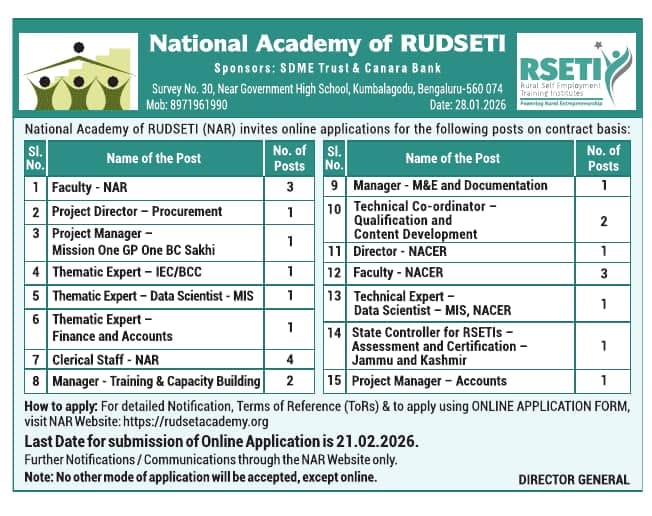 શું તમે ગ્રામ્ય ભારતના વિકાસમાં ફાળો આપવા ઇચ્છો છો? શું તમે યુવાનોને તાલીમ આપી, તેમની જિંદગી બદલવા માંગો છો? તો આ તમારા માટે એક સુંદર તક છે. નેશનલ એકેડેમી ઓફ રુડસેટી (NAR) અને NACER તરફથી વિવિધ પદો માટે અરજીઓ માંગવામાં આવી છે.
