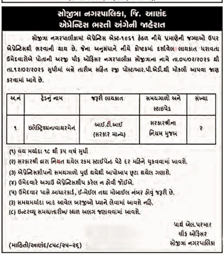 સોજીત્રા નગરપાલિકા, જિલ્લો આણંદ દ્વારા એપ્રેન્ટિસ એક્ટ, 1961 હેઠળ ઇલેક્ટ્રિશ્યન/વાયરમેન ટ્રેડમાં એપ્રેન્ટિસ (શિષ્યવૃત્તિ) ભરતીની જાહેરાત કરવામાં આવી છે. આ એક સુવર્ણ તક છે તે યુવાનો માટે જેમને તકનીકી ક્ષેત્રે કારકિર્દી બનાવવી છે અને સરકારી ક્ષેત્રે કામ કરવાનો અનુભવ મેળવવો છે. આ લેખમાં તમને આ ભરતીની દરેક જરૂરી બાબત, જેમ કે યોગ્યતા, અરજીની પ્રક્રિયા, પસંદગી પદ્ધતિ અને મહત્વપૂર્ણ નિર્દેશો, સરળ ગુજરાતીમાં સમજાવવામાં આવશે.